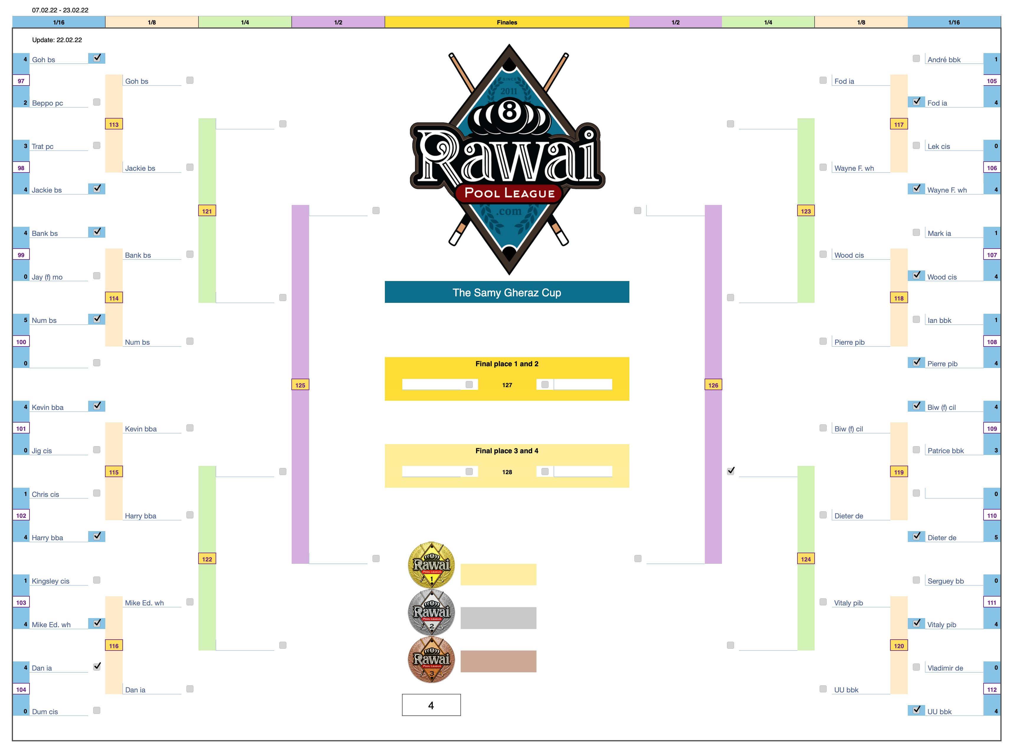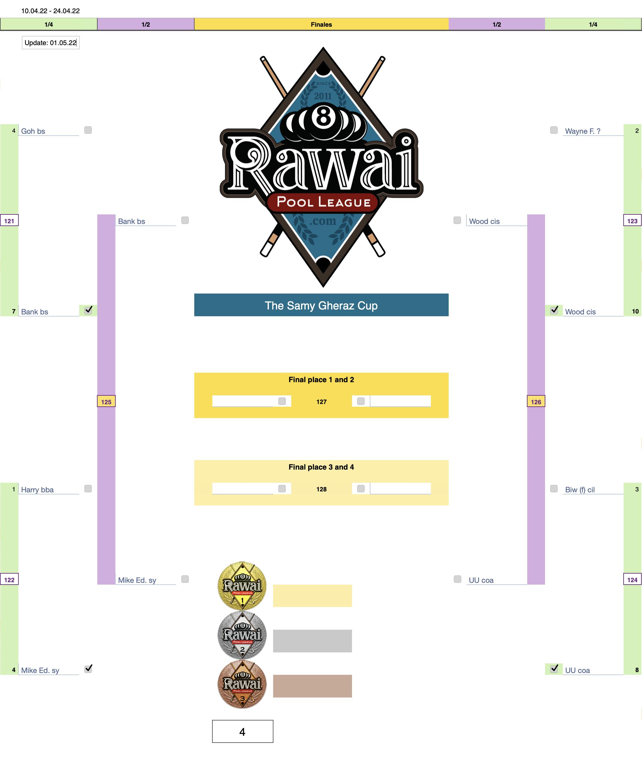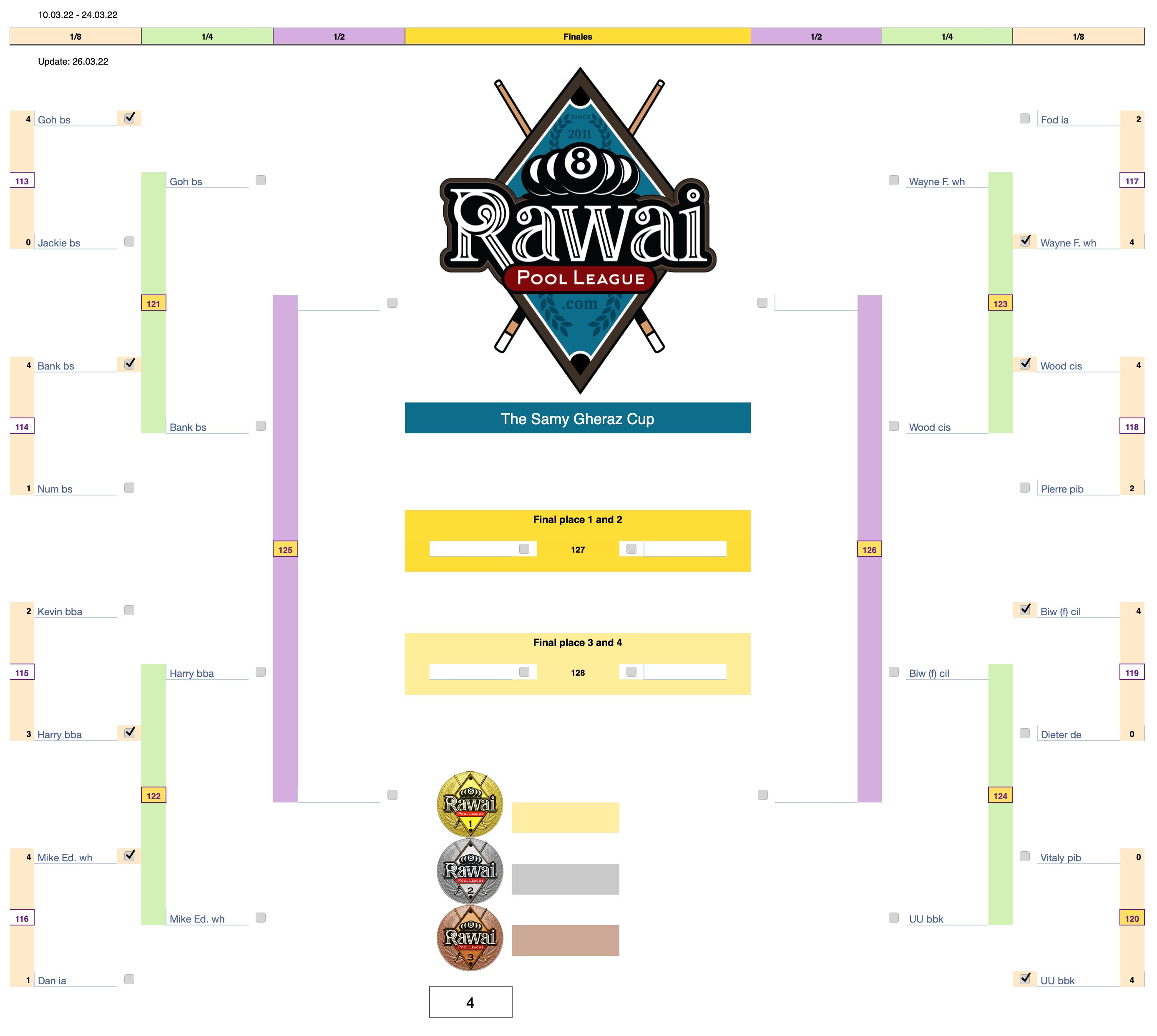 For example: Match N° 1 Goh (bs) - Honzo (de) this match will be played at the Black Sheep bar