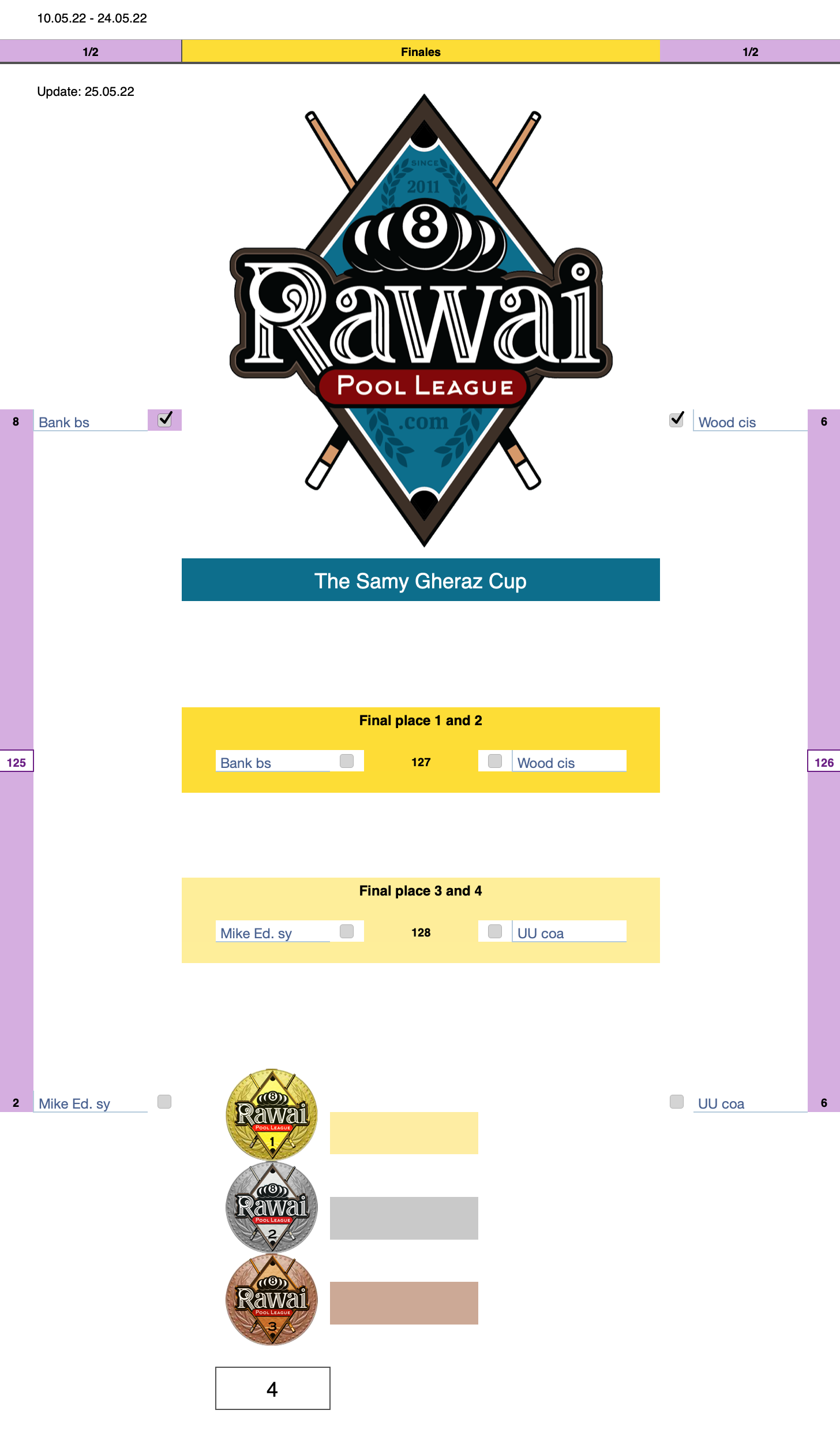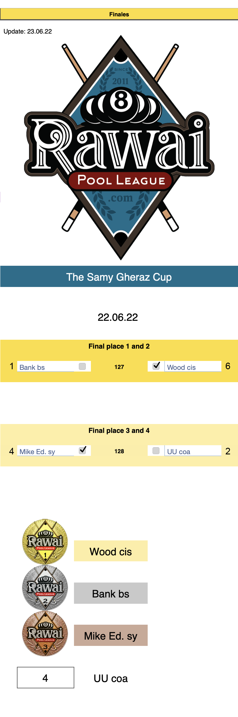 Below you see the list of the 4 players who will compete in the finals (rank 1 - 2 and 3 - 4.