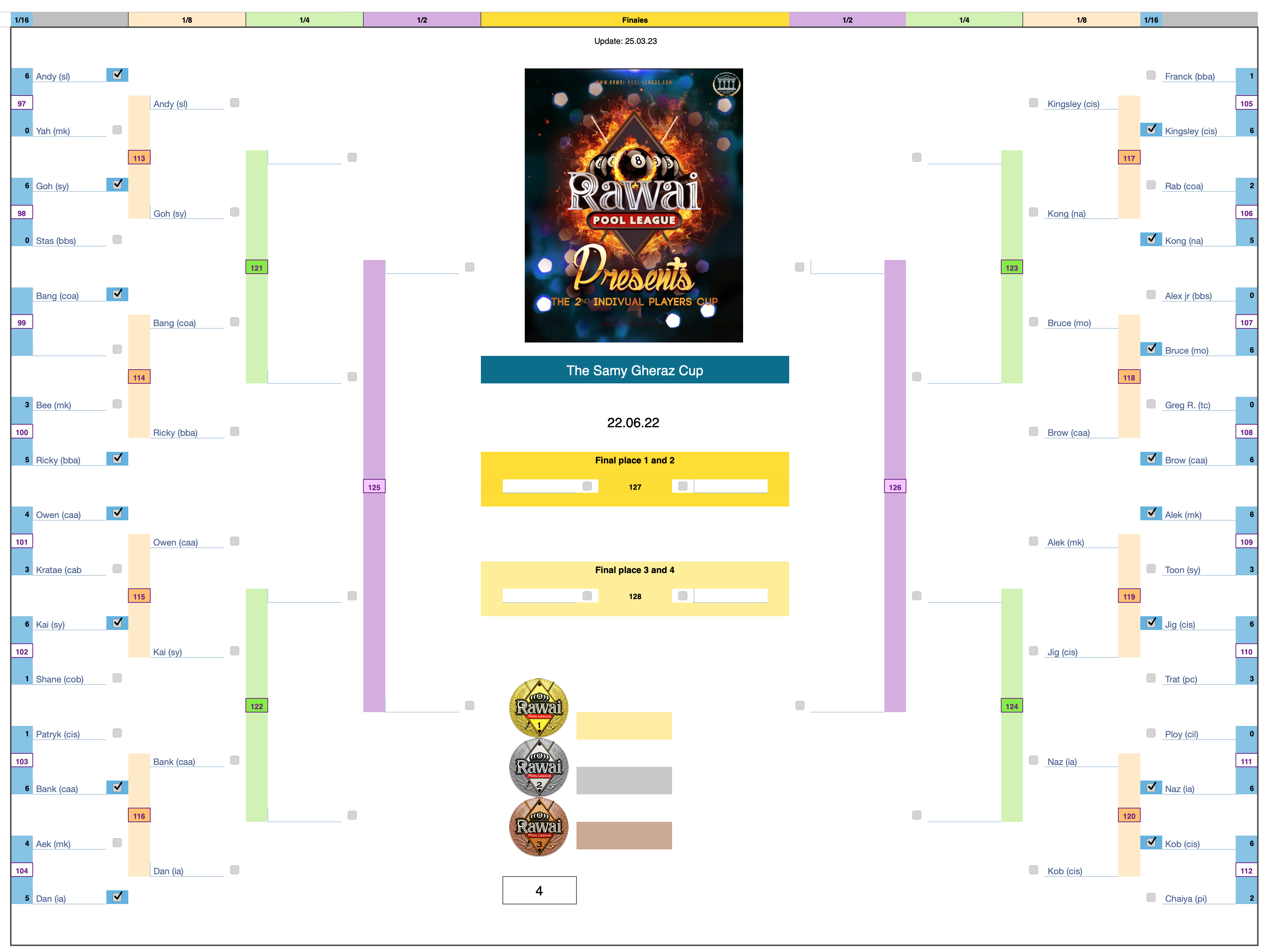 For example: Match N° 1 Goh (bs) - Honzo (de) this match will be played at the Black Sheep bar