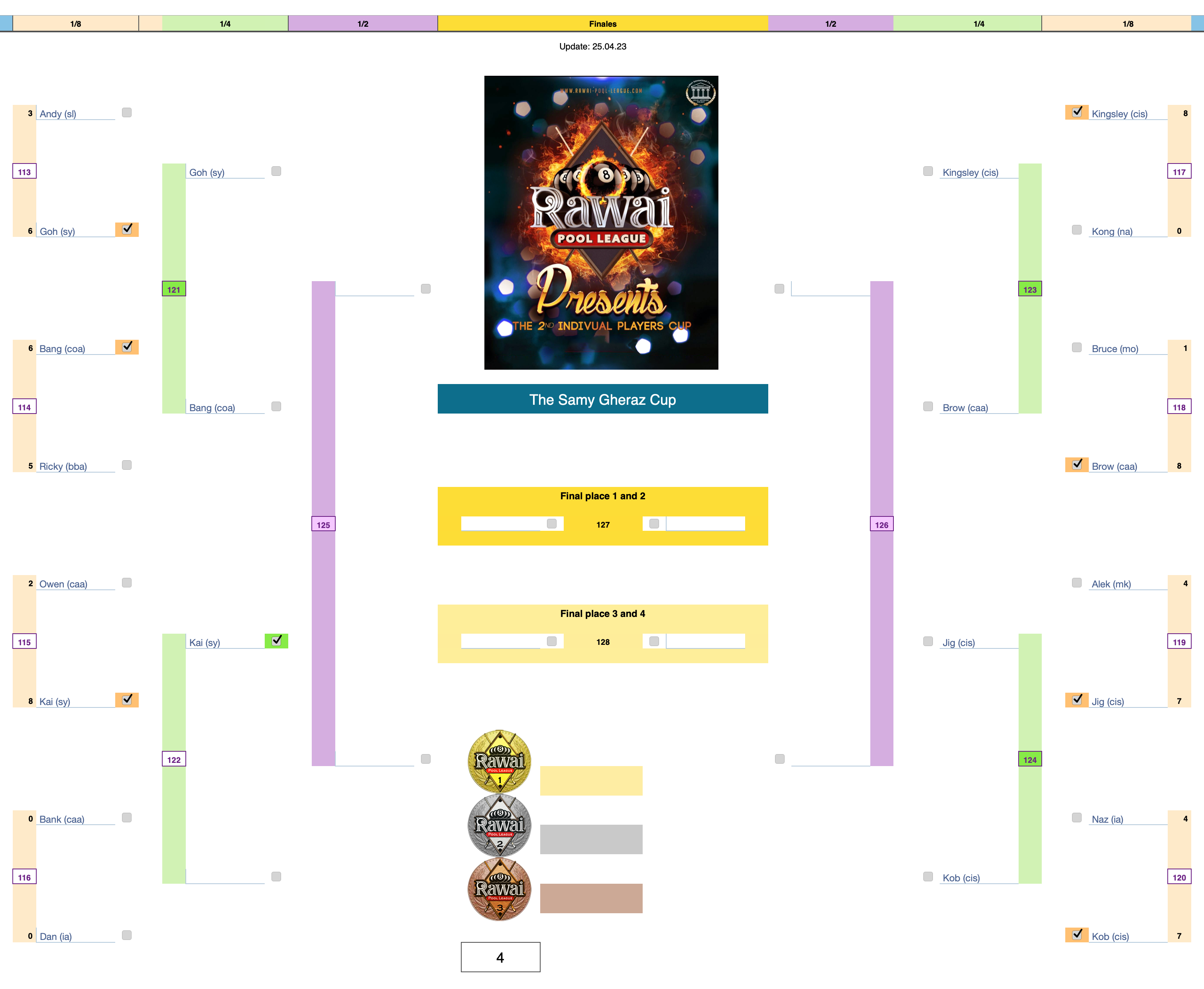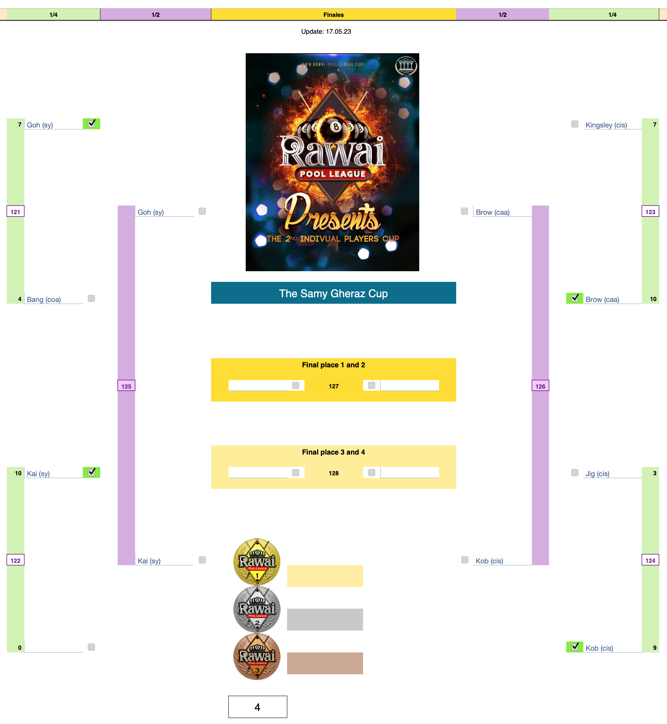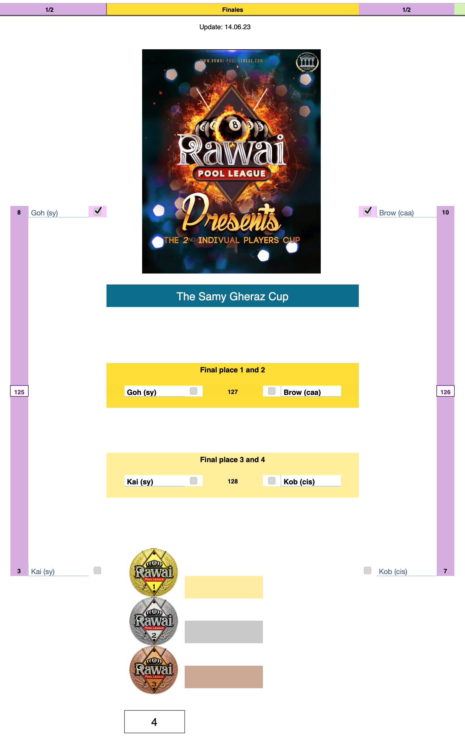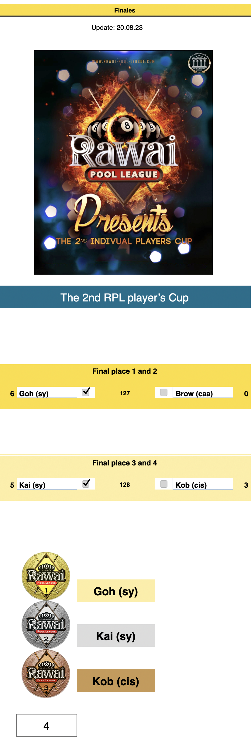 Below you see the list of the 4 players who will compete in the finals (rank 1 - 2 and 3 - 4). This round will be best of 11.