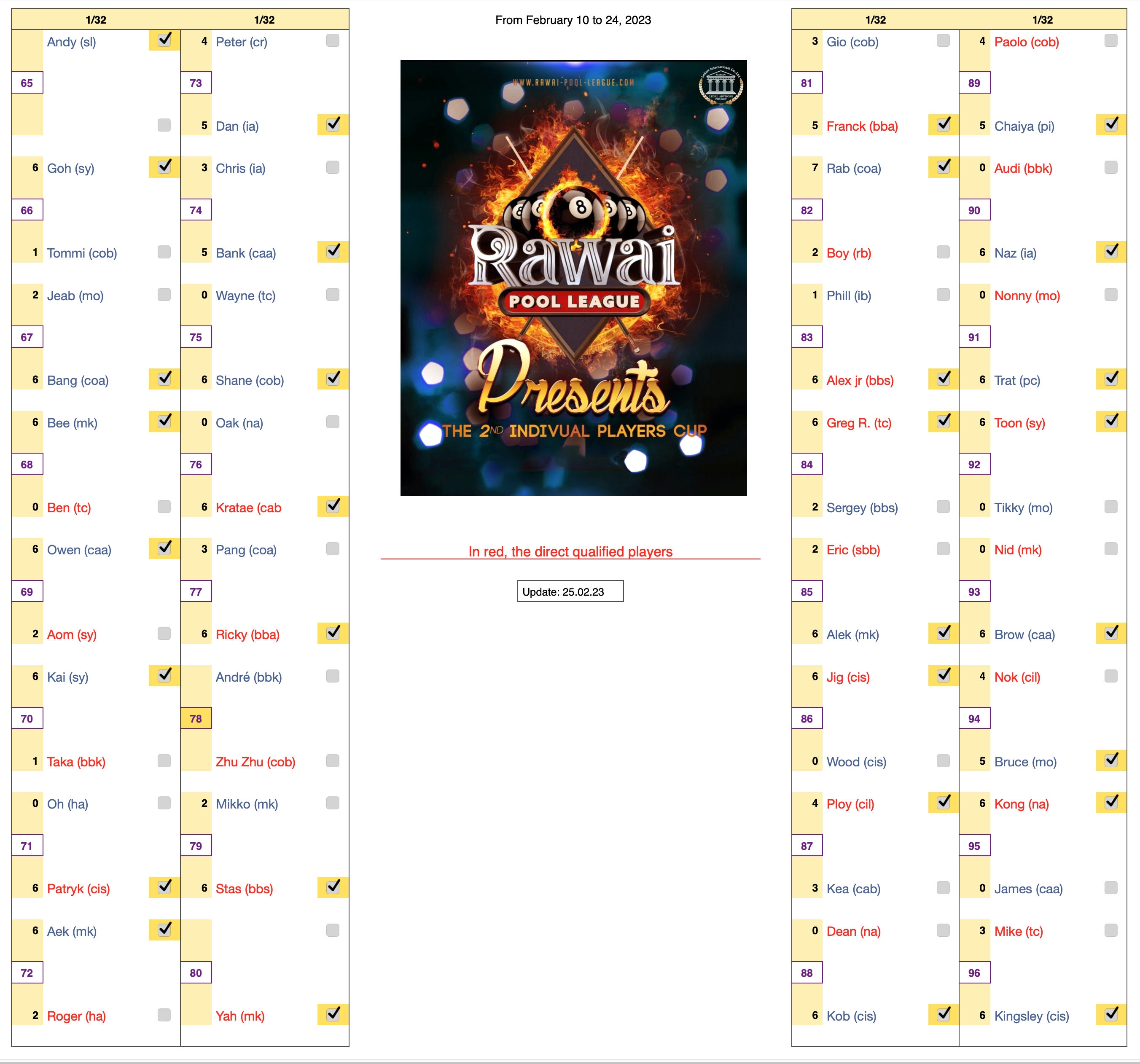 Go to: See the results of the Qualifications / 1/32 and See the timing and situation of the 1/16 / 1/8 / 1/4 / 1/2 / Final
