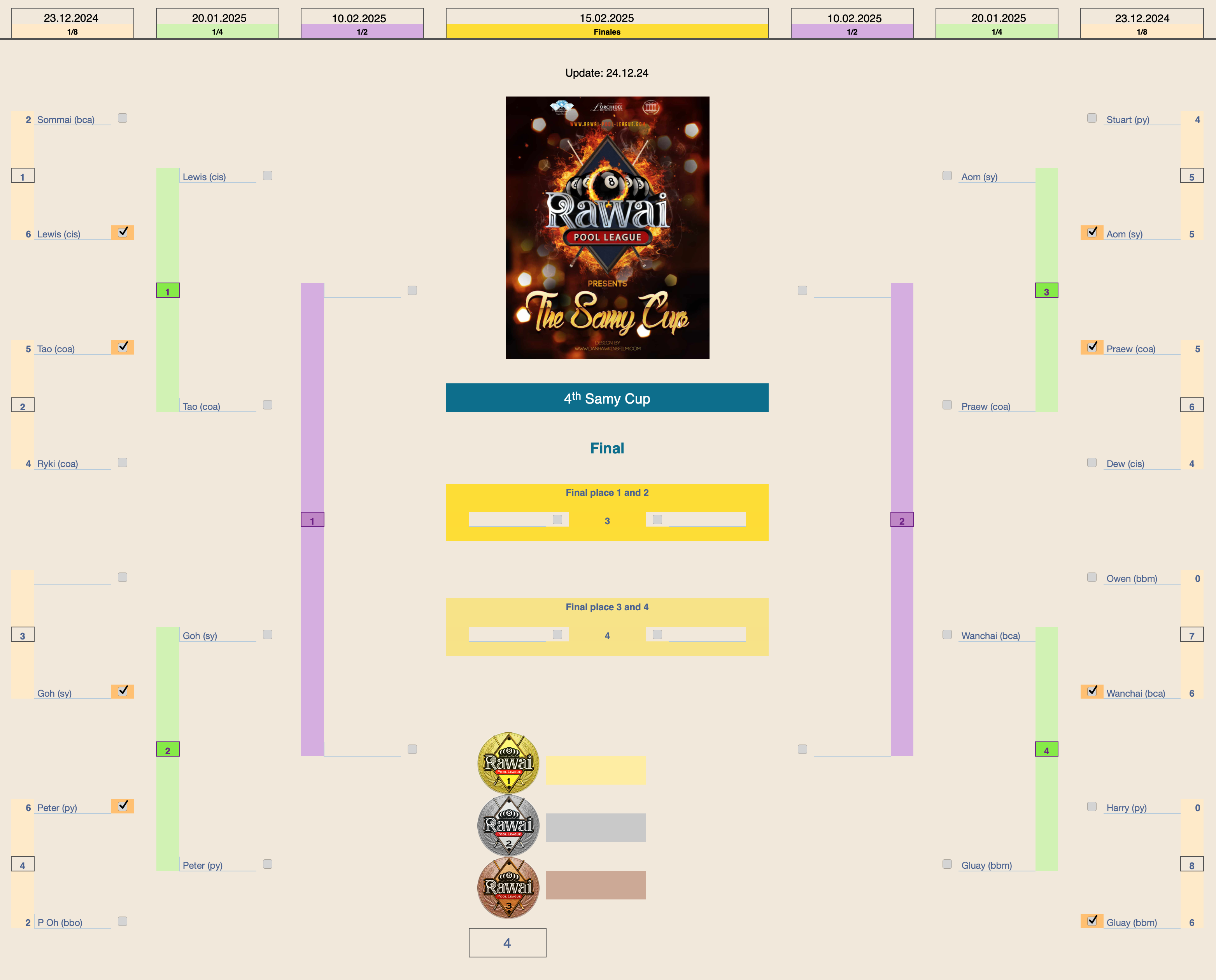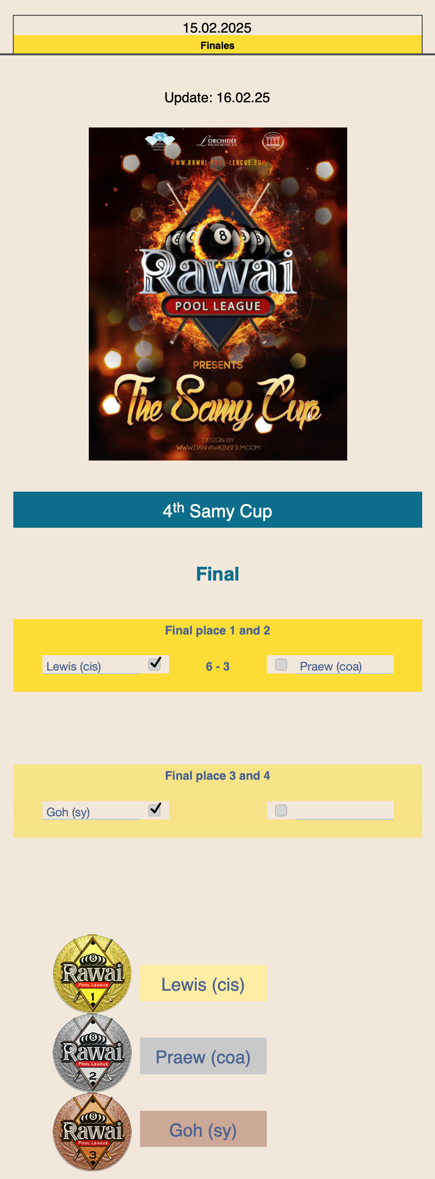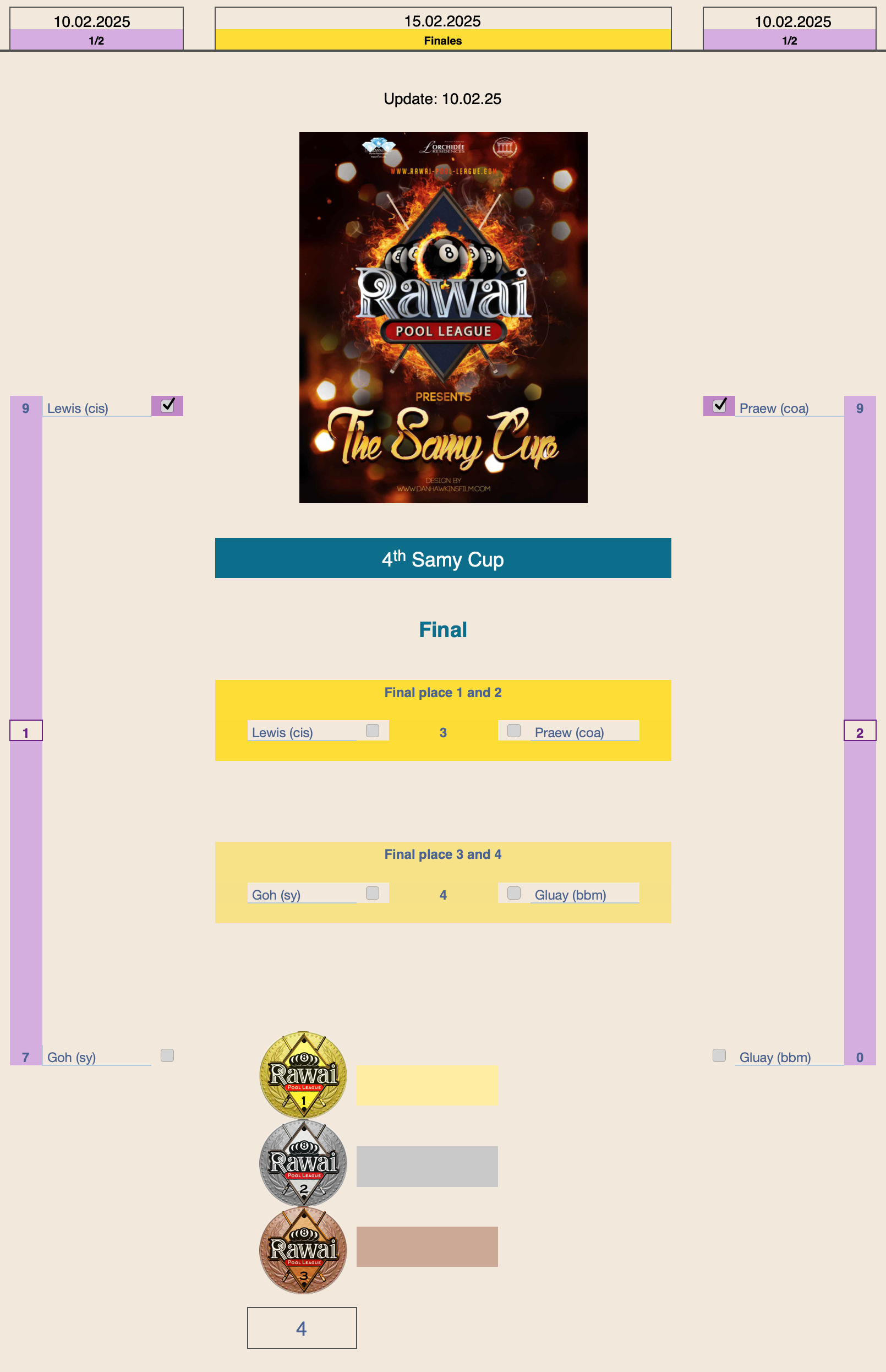 Below you see the list of the 4 players who will compete in the finals (rank 1 - 2 and 3 - 4). This round will be best of 11.