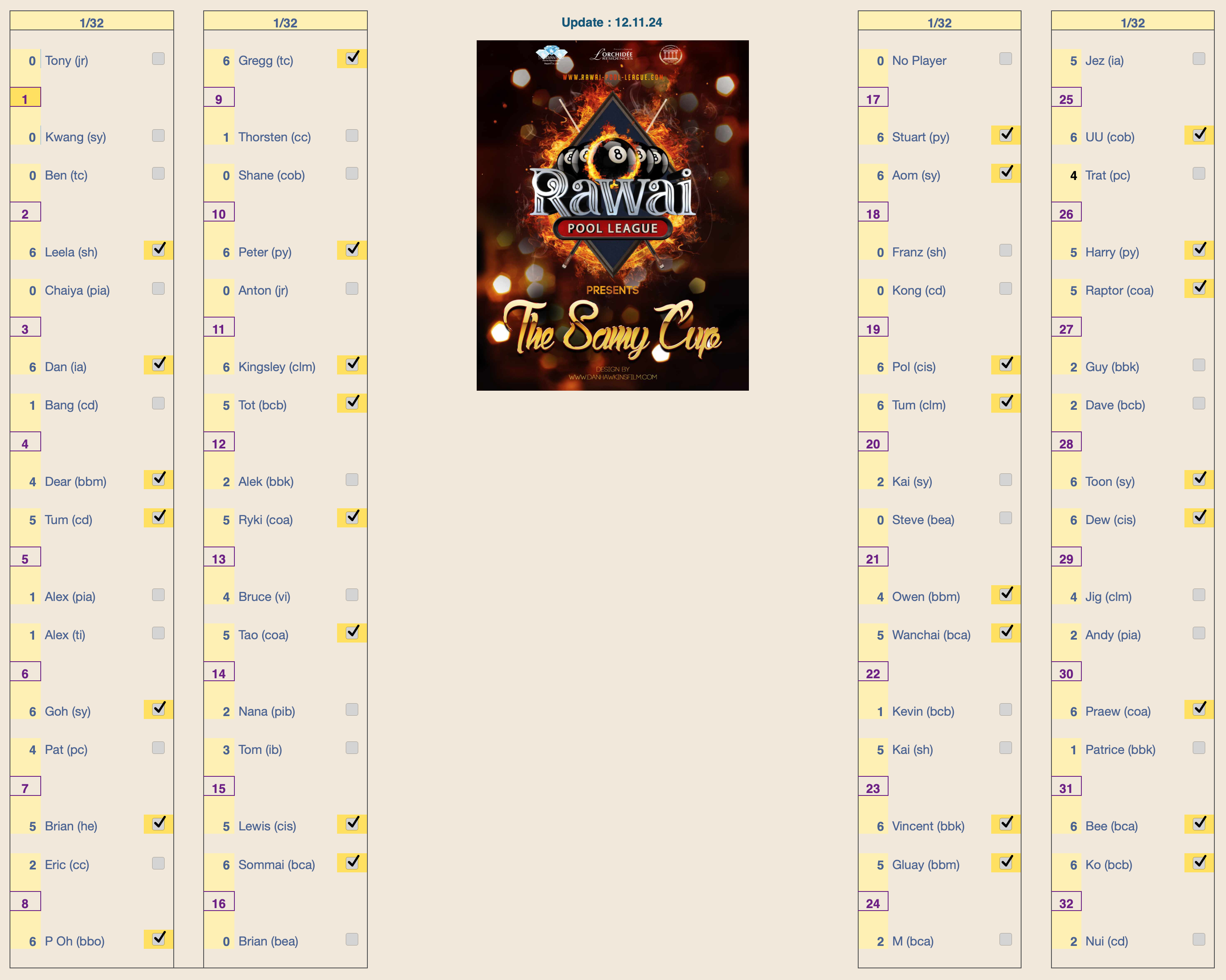 For example: Match N° 1 Goh (bs) - Honzo (de) this match will be played at the Black Sheep bar
