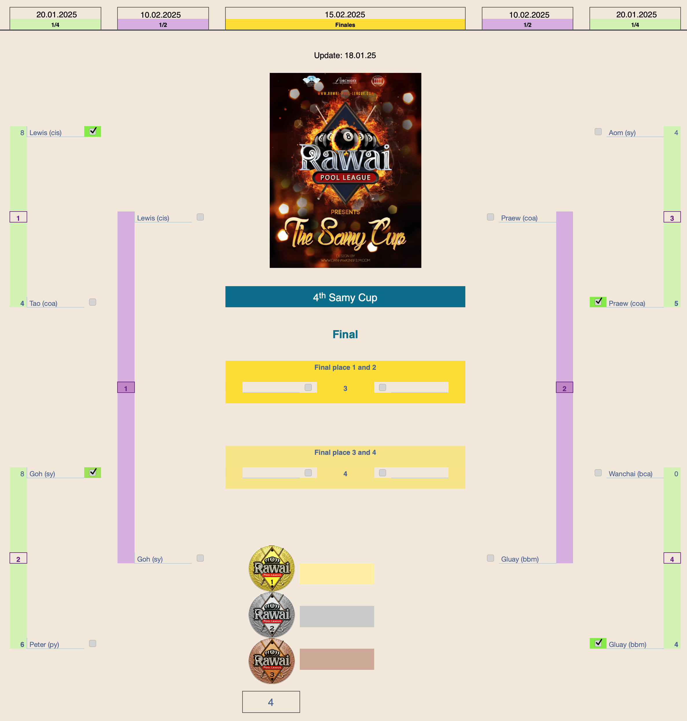 Below you see the list of the 4 players who will compete in the 1/2 finals. This round will be best of 9.